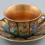 BF jelzéssel: nimfákat ábrázoló, kézzel festett porcelán teás csésze aljjal.