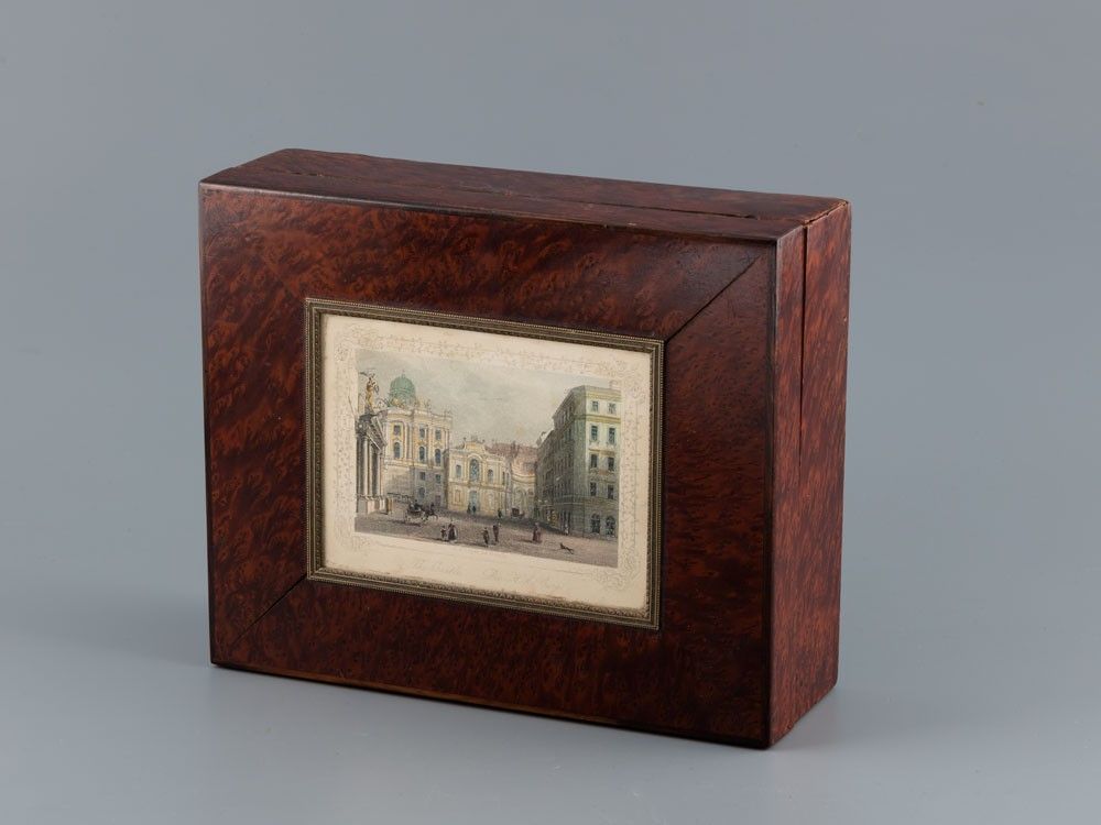 Faragott fa topolya borítással (sarkán kisebb sérülés), fedelén A. H. Payne a bécsi Hofburgot ábrázoló színezett nyomata. Bécs, XIX. sz. második fele. M.: 23,5 × 19,5 × 8,5 cm