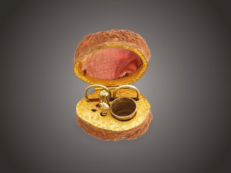 Dióhéjba épített, aprólékosan vésett 14 karátos arany tartólemez, benne arany olló, gyűszű, tűtartó és tű. Egy tartozék hiányzik,