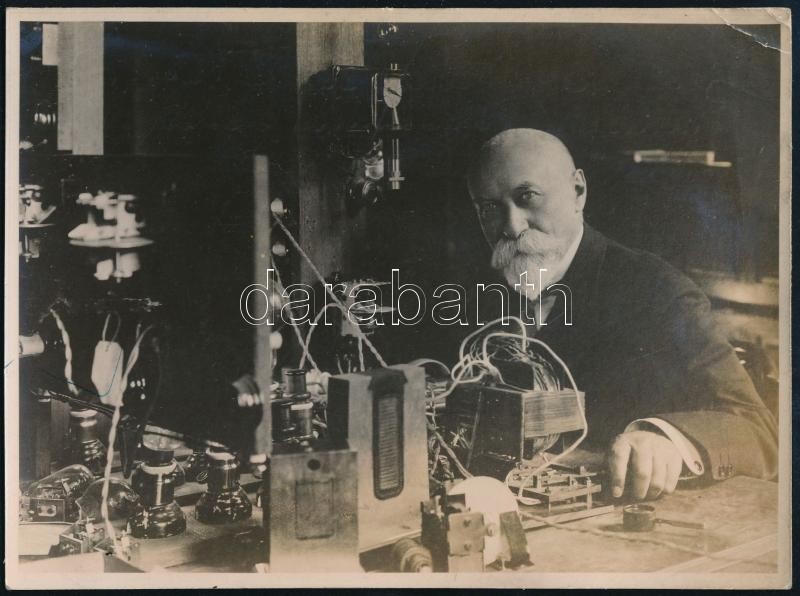 Bláthy Ottó (1860-1939) gépészmérnök, feltaláló, MTA tag laboratóriumában, fotó, az egyik sarkán törésnyommal, 15×11 cm<a href="https://www.darabanth.com/hu/gyorsarveres/412/kategoriak~Fotomuveszet/Foto~500021/Blathy-Otto-1860-1939-gepeszmernok-felt