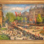 Boldizsár István (1897-1984): Majális Budapesten, 1946. Olaj, vászon, jelezve balra lent. Dekoratív, kissé sérült fa keretben, 60×80 cm. / István Boldizsár (1897-1984): Budapest, 1st of May, 1946. Oil on canvas, signed lower left.