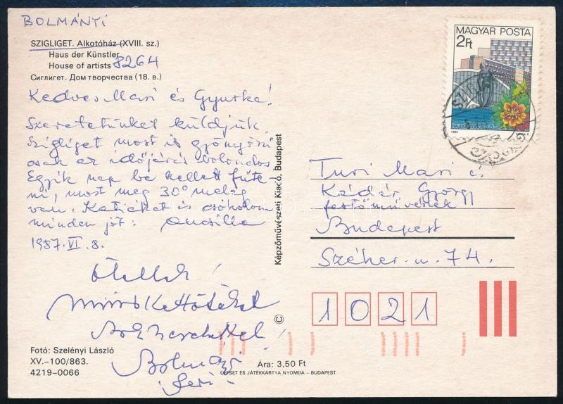 Bolmányi Ferenc által írt autográf és aláírt képeslap Kádár György festőművésznek