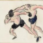 Boris László (1897-1924), 5 db mű: Boksz-sorozat I-V. Vegyes technika, papír, mind jelzett. Hátoldalán Haas Galéria kiállítási címkéivel. Üvegezett fa keretben, 15×22 cm / László Boris (1897-1924), 5 works of art: Box-series I-V. Mixed technique on paper,