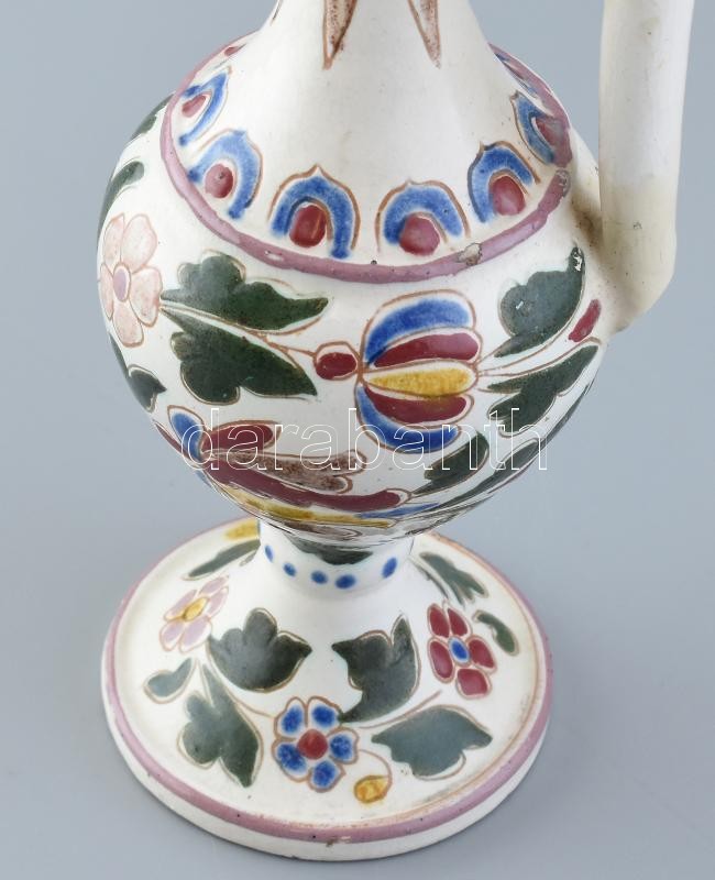 Bozsik Kunszentmárton, kancsó népi dekorral, kézzel festett mázas kerámia, jelzett, mázhibákkal, restaurált, lepattanással m: 29 cm<a href="https://www.darabanth.com/hu/gyorsarveres/412/kategoriak~Porcelan-keramia-uveg/Keramiak~500005/Bozsik-Kunszen