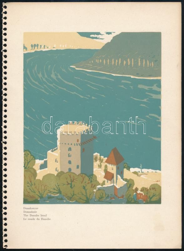 Budapest nevezetességeit ábrázoló 5 db színes linómetszet. Papír, jelzés nélkül, feliratozva, spirálfűzéses füzetből, helyenként foltos lapok, 18×14 cm<a href="https://www.darabanth.com/hu/gyorsarveres/410/kategoriak~Festmenyek-es-grafikak/Ex-libris