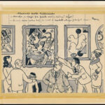 Byssz Róbert (1893-1961): Absztrakt festők kiállításán (karikatúra). Tus, papír. Jelezve jobbra fent. Papírra kasírozva, ragasztószalaggal rögzítve. 17×21,5 cm