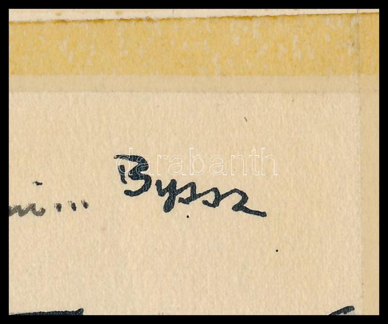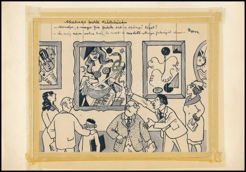 Byssz Róbert (1893-1961): Absztrakt festők kiállításán (karikatúra). Tus, papír. Jelezve jobbra fent. Papírra kasírozva, ragasztószalaggal rögzítve. 17×21,5 cm<a href="https://www.darabanth.com/hu/gyorsarveres/431/kategoriak~Festmenyek-es-grafikak/F