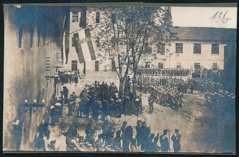 ca 1915 Az óbudai királyi Dunai Flottilla laktanya utvarán tartott katonai sorakozó, a magyar zászlóval / Danube Fleet The yard of the Óbuda barracks. Notice the Hungarian flag flying from the building. 13×8,5 cm
