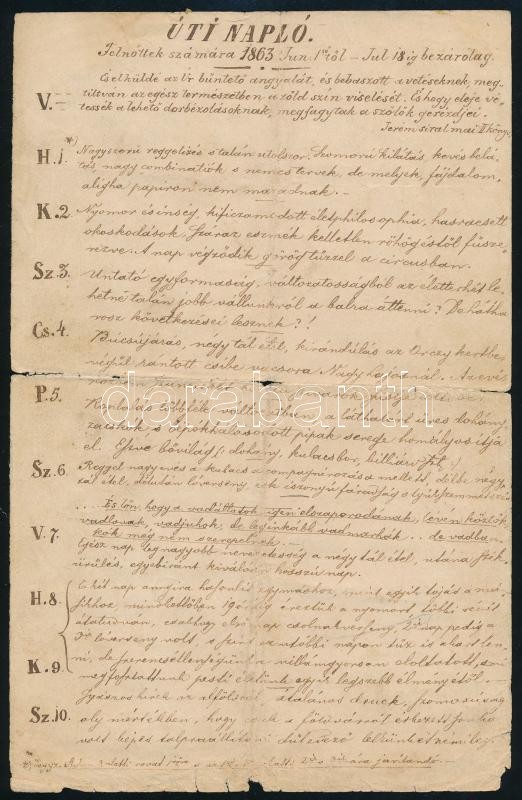 cca 1863 Úti napló felnőttek számára, 1863. Jun. 1-től – Jul. 18-ig bezárólag. Humoros, verses szöveg, 6 kézzel írt, illusztrált oldal, kisebb sérülésekkel, az egyik lap ragasztott