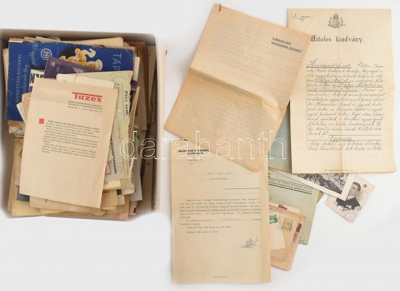 cca 1880-1940 Papírrégiség hagyaték tétel: benne filatélia, okmányok, fotók, judaika, katonai okmányok is<a href="https://www.darabanth.com/hu/gyorsarveres/415/kategoriak~Mutargy-papirregiseg-egyeb/Nyomtatvanyok~1500002/cca-1880-1940-Papirregiseg-ha