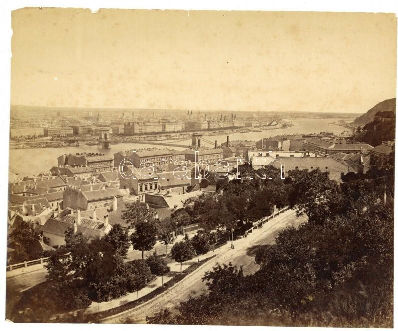 cca 1880 Budapest Lánchíd a Várhegyről. nagy méretű keményhátú fotó, paszpartuban. Képméret 22×16 cm<a href="https://www.darabanth.com/hu/gyorsarveres/417/kategoriak~Fotomuveszet/Foto~22/cca-1880-Budapest-Lanchid-a-Varhegyrol-nagy-meretu-kemenyhatu-