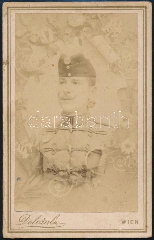 cca 1880 Katonaportré, keményhátú fotó Dolezal bécsi műterméből, 10,5×6,5 cm<a href="https://www.darabanth.com/hu/gyorsarveres/415/kategoriak~Mutargy-papirregiseg-egyeb/Militaria~500028/cca-1880-Katonaportre-kemenyhatu-foto-Dolezal-becsi-mutermebol-