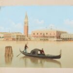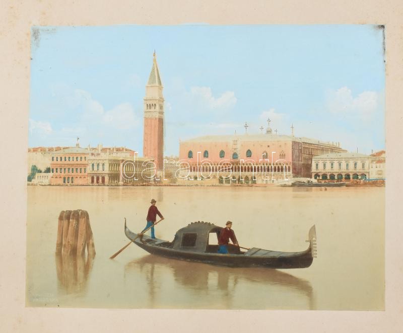cca 1885-1890 Ricordo di Venezia, 20 db színezett fotó. Venezia, Charlo Naya, 1 p.+20 t. Dúsan aranyozott haránt-alakú egészvászon-kötés, foltos, kopott borítóval, kissé sérült gerinccel, kissé foltos lapokkal, cca 19×24 cm, album: