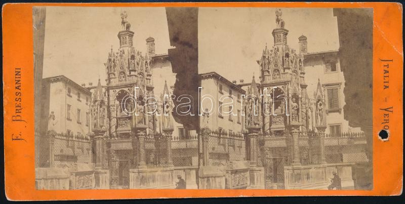cca 1890-1900 A veronai Scaligeri síremlék keményhátú sztereófotója, Verona, E. Bressanini, lyukas, 8×17 cm<a href="https://www.darabanth.com/hu/gyorsarveres/417/kategoriak~Fotomuveszet/Foto~22/cca-1890-1900-A-veronai-Scaligeri-siremlek-kemenyhatu-s