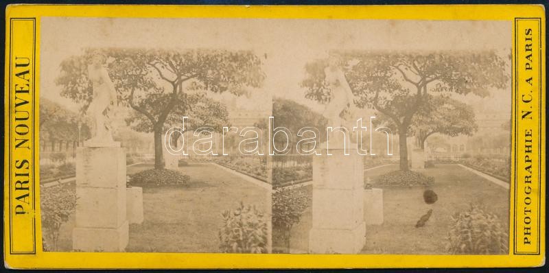 cca 1890-1900 Jardin Palais Royal, A királyi palotakert keményhátú sztereófotója, Paris Nouveau Photographie N.C. a Paris, a hátoldalán feliratozva, a felületén apró foltokkal, 8×17 cm<a href="https://www.darabanth.com/hu/gyorsarveres/417/kategoriak