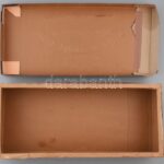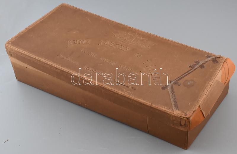 cca 1890-1910 Kuncz József és Társa cs. és kir. udvari szállítók vászon-, fehérnemű- és szőnyegraktárának karton doboza, sérült, a fedele amatőr módon javított, pótolt, a pótlás miatt a fedél nem teljes illeszkedik az aljához, 55x25x11 cm. Ritka!<a