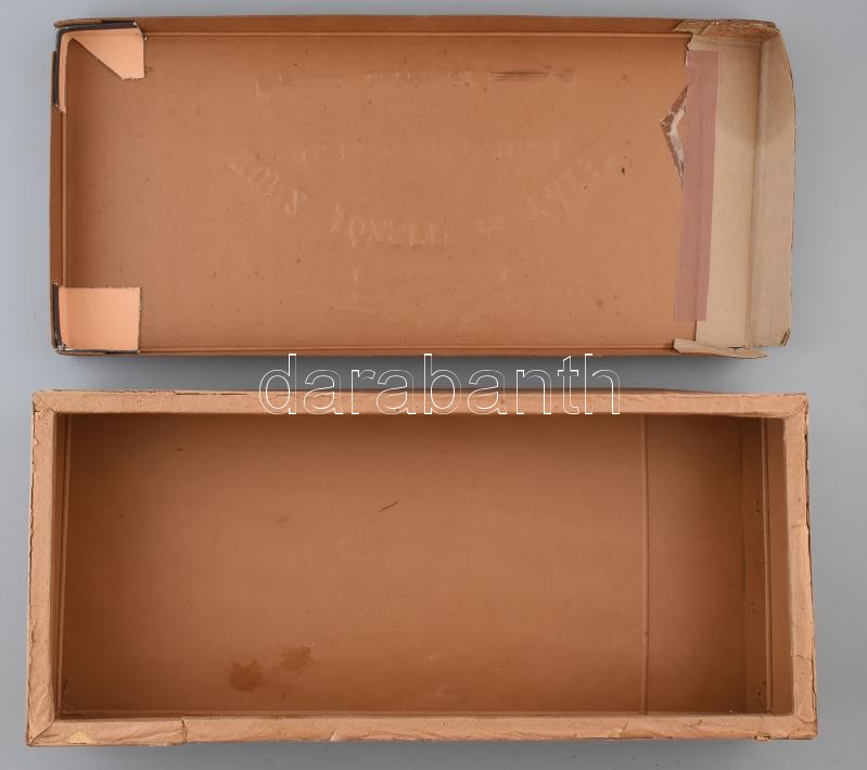 cca 1890-1910 Kuncz József és Társa cs. és kir. udvari szállítók vászon-, fehérnemű- és szőnyegraktárának karton doboza, sérült, a fedele amatőr módon javított, pótolt, a pótlás miatt a fedél nem teljes illeszkedik az