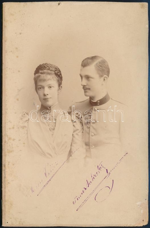 cca 1890 Mária Valéria főhercegnő és Ferenc Szalvátor főherceg, keményhátú fotó Adéle műterméből, felületi sérülésekkel, / Maria Valera countess and count Franz Salvator 19,5×12,5 cm<a href="https://www.darabanth.com/hu/nagyaukcio/38/kategoriak~Muta
