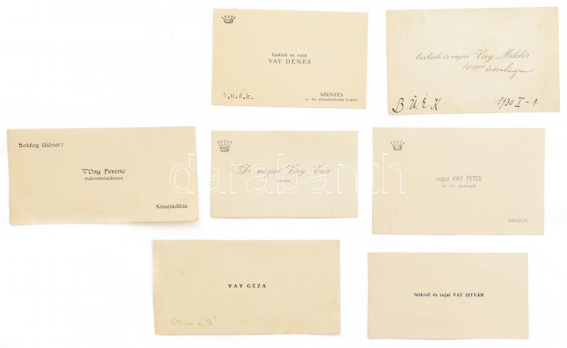 cca 1900 7 db vajai Vay családi névjegy, benne néhány bárói koronával<a href="https://www.darabanth.com/hu/gyorsarveres/417/kategoriak~Mutargy-papirregiseg-egyeb/Nyomtatvanyok~500002/cca-1900-7-db-vajai-Vay-csaladi-nevjegy-benne-nehany-baroi-koronav