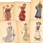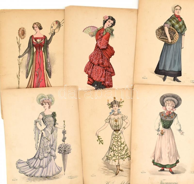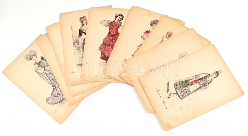 cca 1900 C. Heinemann jelzéssel 13 db különféle ölözeteket viselő nőket ábrázoló litográfia: orosz parasztasszony, fundango, francia forradalmi lány stb. Kőnyomat-papír / lithography 20×28 cm<a href="https://www.darabanth.com/hu/gyorsarveres/414/kat