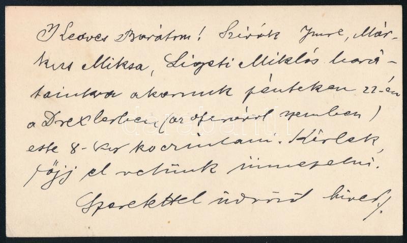 cca 1900 Feszty Árpád (1856-1914) festőművész névjegye autográf soraival, melyben koccintásra invitálja Kézdi-Kovács Lászlót (1864-1942) a Drexlerbe.<a href="https://www.darabanth.com/hu/gyorsarveres/417/kategoriak~Mutargy-papirregiseg-egyeb/Tortene