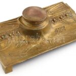 cca 1900 Szecessziós réz asztali tolltartó és tintatartó, üvegbetét nélkül, fedél pótolt és nem illeszkedik, sz: 27 cm / Art nouveau pen holder, without glass, cap not original and not matching<a href="https://www.darabanth.com/hu/gyorsarveres/412/k