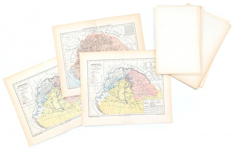 cca 1900 Vegyes magyar történelmet ábrázoló térkép tétel, 13 db, közte 1 db Nagy Képes Világtörténet, 4 db Pallas, 8 db Magyar Nemzet Története), 25×31 cm és 23×30 cm közötti méretben.