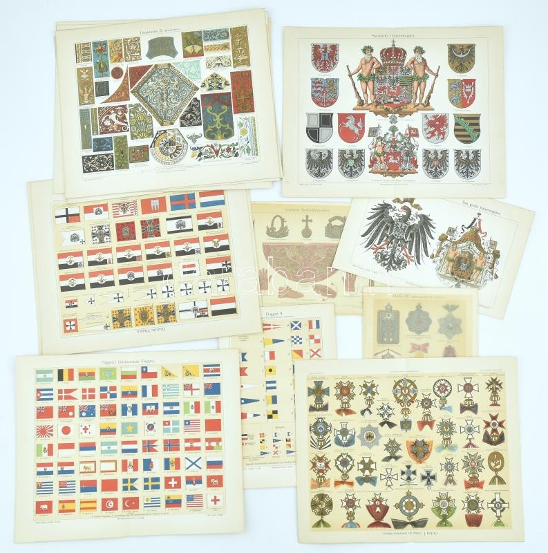 cca 1900 Zászlók, címerek, kitüntetések, ornamentika 15 db litografált tábla 31×25 cm