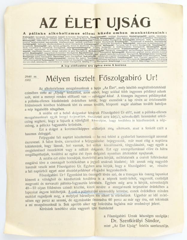 cca 1910 Az Élet c. alkoholellenes lap felhívása