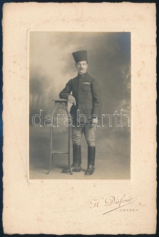 cca 1910 Francia katona (Gaston Moreau) portréja, kartonra kasírozott fotó H. Dufour neversi műterméből, hátoldalán feliratozott, 10,5×7 cm / Portrait of a French soldier (Gaston Moreau), vintage photo<a href="https://www.darabanth.com/hu/gyorsarver