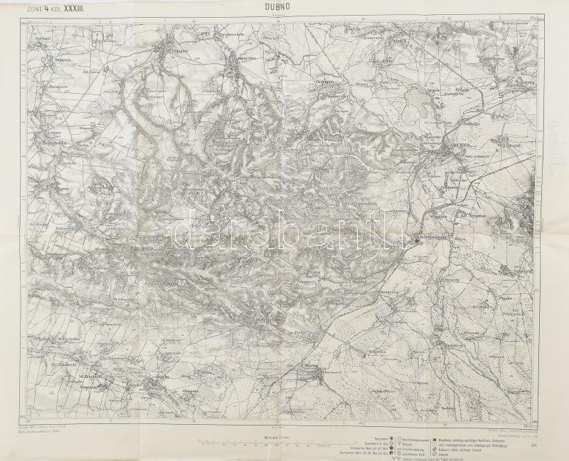 cca 1913 Dubno, Zone 4. Kol. XXXIII. / Dubno és környéke, katonai térkép, 1 : 75.000, hajtva, 54×43 cm<a href="https://www.darabanth.com/hu/gyorsarveres/415/kategoriak~Mutargy-papirregiseg-egyeb/Terkepek~500029/cca-1913-Dubno-Zone-4-Kol-XXXIII-Dubno