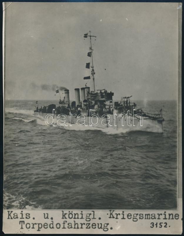 cca 1914-1918 Az Osztrák-Magyar Császári és Királyi Haditengerészet (K.u.K. Kriegsmarine) Huszár-osztályú rombolója (Zerstörer), feliratozott fotó, sarkain apró sérülésekkel, 21,5×17 cm / cca 1914-1918 A Huszár-class destroyer (Zerstörer) of the Austro-Hu