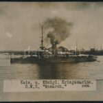 cca 1914-1918 SMS Monarch, az Osztrák-Magyar Császári és Királyi Haditengerészet (K.u.K. Kriegsmarine) Monarch-osztályú partvédő páncélosa kifut a pólai kikötőből, feliratozott fotó, az egyik sarkán kis sérüléssel, 22,5×17 cm /