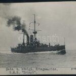 cca 1914-1918 SMS Zrínyi, az Osztrák-Magyar Császári és Királyi Haditengerészet (K.u.K. Kriegsmarine) Radetzky-osztályú pre-dreadnought csatahajója (Schlachtschiff) menetben, feliratozott fotó, az egyik sarkán kissé sérült, 22×17 cm / cca 1914-1918 SMS Zr