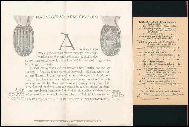 cca 1914 A hadsegélyező emlékérem leírása és megrendelőlapja, 2 db<a href="https://www.darabanth.com/hu/gyorsarveres/420/kategoriak~Mutargy-papirregiseg-egyeb/Militaria~500028/cca-1914-A-hadsegelyezo-emlekerem-leirasa-es-megrendelolapja-2-db~II26595