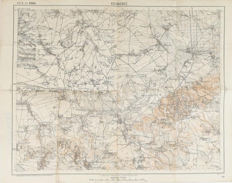 cca 1914 Krzemieniec, Zone 5. Kol. XXXIII. / Kremenec és környéke, katonai térkép, 1 : 75.000, hajtva, 54×42,5 cm<a href="https://www.darabanth.com/hu/gyorsarveres/415/kategoriak~Mutargy-papirregiseg-egyeb/Terkepek~500029/cca-1914-Krzemieniec-Zone-5