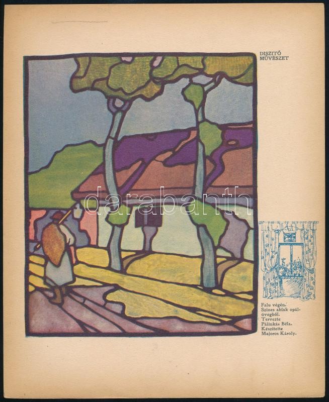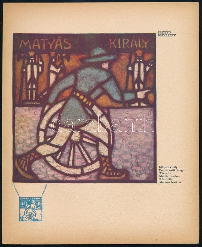 cca 1914 Majoros Károly üvegfestő művész által készített üvegablakok (Mátyás király, terv.: Muhits Sándor; Falu végén, terv.: Pálinkás Béla), 2 db színes reprodukció, a Díszítő Művészet I. évfolyamának mellékletei,