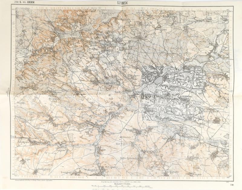 cca 1914 Szumsk, Zone 5. Kol. XXXIV. / Szumszk és környéke, katonai térkép, 1 : 75.000, hajtva, 54×42 cm<a href="https://www.darabanth.com/hu/gyorsarveres/415/kategoriak~Mutargy-papirregiseg-egyeb/Terkepek~500029/cca-1914-Szumsk-Zone-5-Kol-XXXIV-Szu
