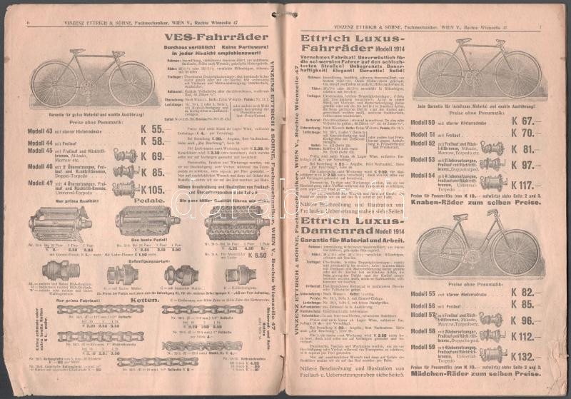 cca 1914 Vinzenz Ettrich & Söhne Fachmechaniker und Grosshändler Wien Engros-Preisbuch 1914-15. Vinzenz Ettrich és Fia Bécsi Szakszerelők és Nagykereskedők árjegyzéke. Wien, Vinzenz Ettrich-ny., 67+1 p. Német nyelven. Gazdag képanyaggal illusztrált. Kiadói papírkötés, foltos, szakadt borítóval, foltos, szakadt