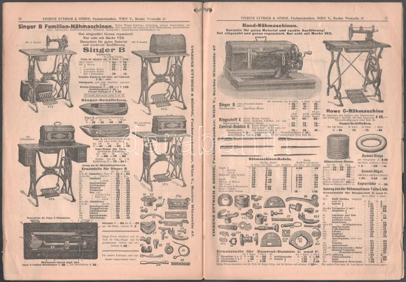 cca 1914 Vinzenz Ettrich & Söhne Fachmechaniker und Grosshändler Wien Engros-Preisbuch 1914-15. Vinzenz Ettrich és Fia Bécsi Szakszerelők és Nagykereskedők árjegyzéke. Wien, Vinzenz Ettrich-ny., 67+1 p. Német nyelven. Gazdag képanyaggal illusztrált. Kiadói papírkötés, foltos, szakadt borítóval, foltos, szakadt borítóval.