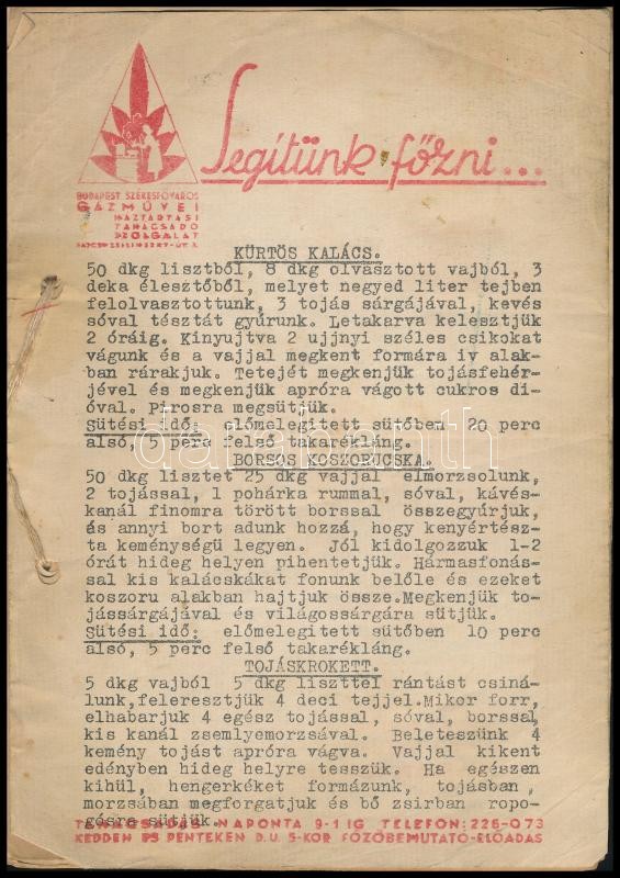 cca 1920-1930 Segítsünk főzni? Segítünk főzni… Bp., Budapest Székesfőváros Gázművek Háztartási Tanácsadó Szolgálat, 13 sztl. lev.+20 sztl. lev. Kiadói papírmappában, a borítón gyűrődésnyomokkal, foltos, egy lapon szakadással.<a href="https://www.d
