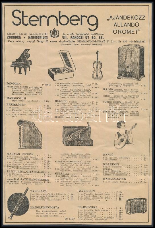 cca 1920 Sternberg Kir. Udvari hangszergyár hangszer árjegyzéke, kartonra kasírozva, 28×19 cm<a href="https://www.darabanth.com/hu/gyorsarveres/412/kategoriak~Mutargy-papirregiseg-egyeb/Reklam~500022/cca-1920-Sternberg-Kir-Udvari-hangszergyar-hangsz