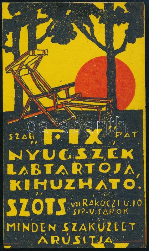cca 1920 ‘Szab ‘Fix’ Pat nyugszék lábtartója, kihúzható – Szőts, VII Rákóczi u. 10 Sip-u. sarok’, linó, reklámos számolócédula, 12×7 cm<a href="https://www.darabanth.com/hu/nagyaukcio/38/kategoriak~Mutargy-szobor-papirregiseg/Reklam~15585/cca-1920-S
