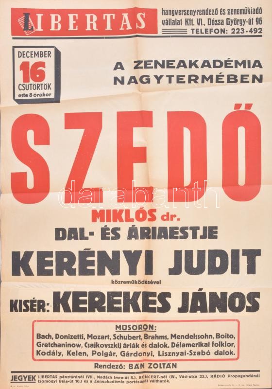 cca 1930-1940 2 db hangverseny plakát, Muzsika és Libertas hangversenyrendező irodák műsoraira, a Zeneakadémia nagytermébe, 84×59 cmx2<a href="https://www.darabanth.com/hu/gyorsarveres/410/kategoriak~Mutargy-papirregiseg-egyeb/Zenetortenet-Kottak-Ha