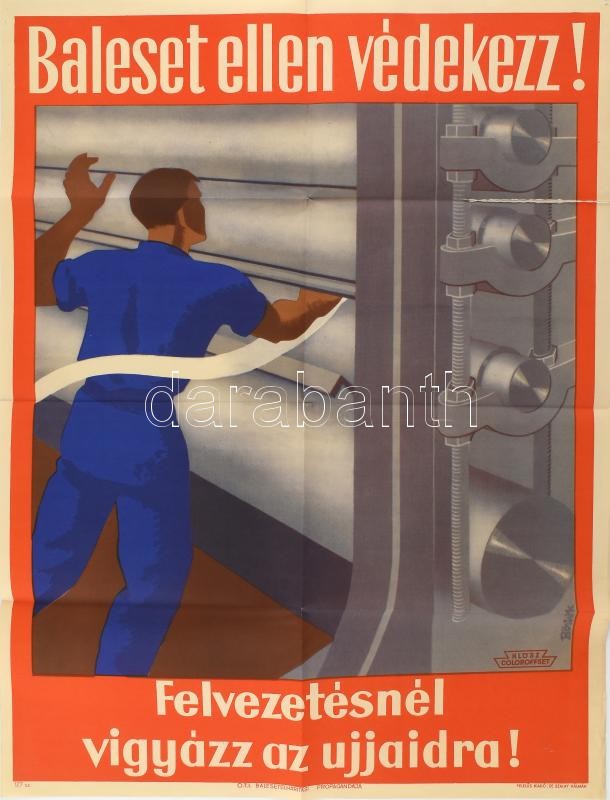 cca 1930-40 Börtsök László (?-?): Baleset ellen védekezz! Felvezetésnél vigyázz ujjaidra! O.T.I. balesetelhárítási propagandája. Plakát, papír, Klösz coloroffset, jelzett a plakáton, hajtásnyomokkal, szakadással, 63×48 cm<a href="https://www.daraban