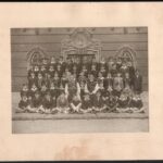 cca 1930 Bp., a Budai Ciszterci Szent Imre Gimnázium tablóképe, rajta Bitter Illés (1868-1939) igazgató, kartonra ragasztott fotó, a kartonon törésnyommal, foltokkal, hátoldalán feliratozva, 21,5×16,5 cm