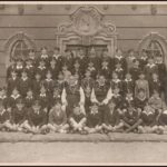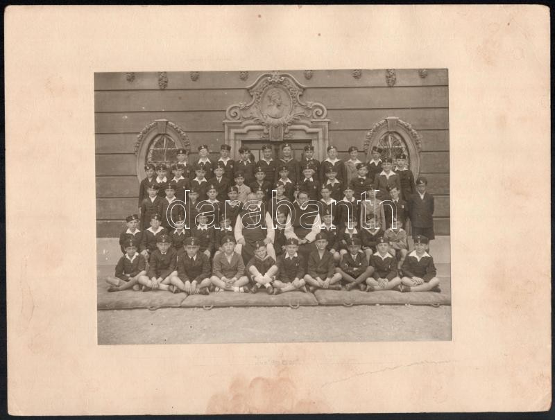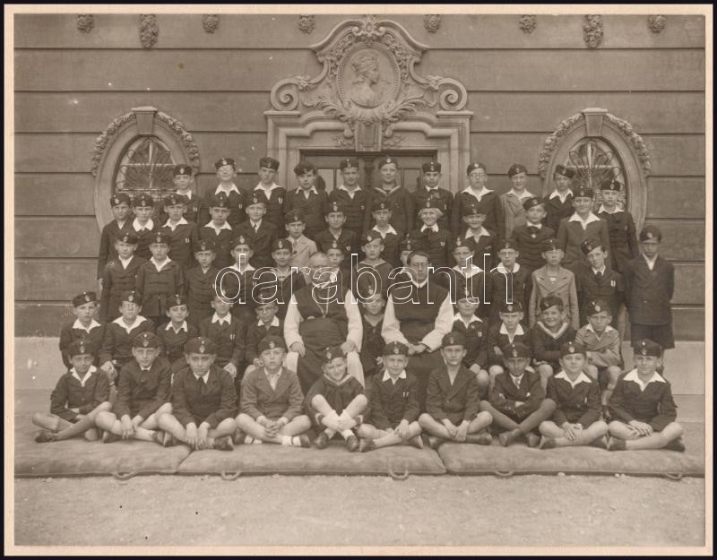 cca 1930 Bp., a Budai Ciszterci Szent Imre Gimnázium tablóképe, rajta Bitter Illés (1868-1939) igazgató, kartonra ragasztott fotó, a kartonon törésnyommal, foltokkal, hátoldalán feliratozva, 21,5×16,5 cm<a href="https://www.darabanth.com/hu/gyorsarv