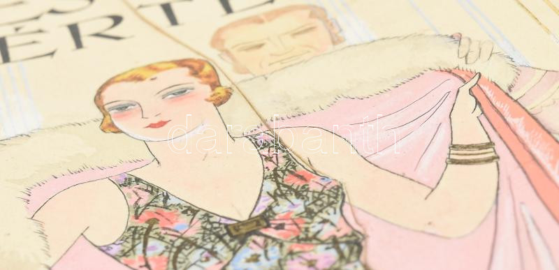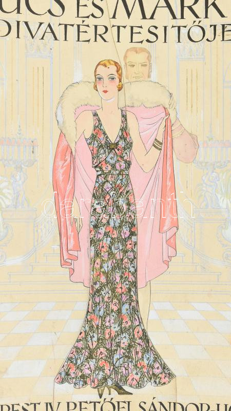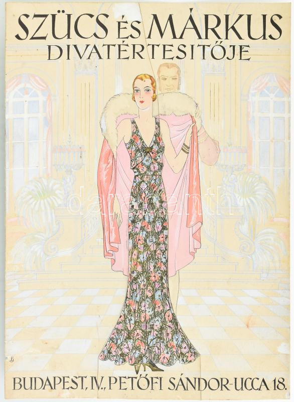 cca 1930 Pál György (1906-1986): ‘Szűcs és Márkus Divatértesítője. Budapest, IV.,Petőfi Sándor-ucca 18.’ Címlapterv, vegyes technika, papír, jelzett, kis sérüléssel, kis folttal, a hátoldalán törésnyommal, 24,5×18 cm<a href="https://www.darabanth.co