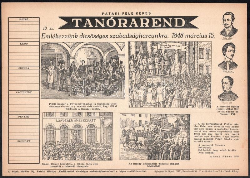 cca 1930 Pataki-féle képes tanrend, Emlékezzünk dicsőséges szabadságharcunkra, kétoldalas látványos grafikákkal, kitöltetlen, szép állapotban<a href="https://www.darabanth.com/hu/gyorsarveres/415/kategoriak~Mutargy-papirregiseg-egyeb/Nyomtatvanyok~1