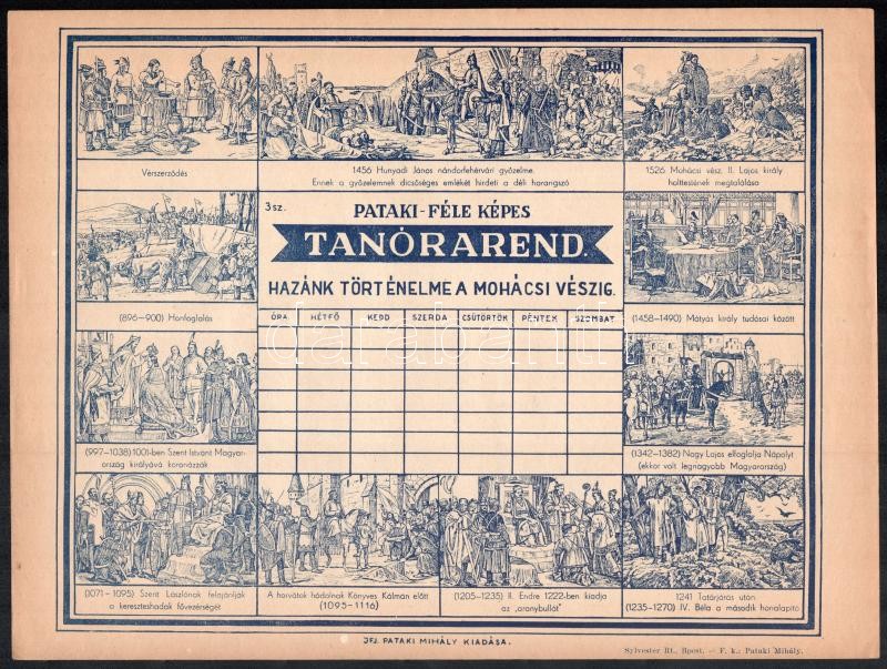 cca 1930 Pataki-féle képes tanrend, Hazánk történelme a mohácsi vészig, kitöltetlen, szép állapotban